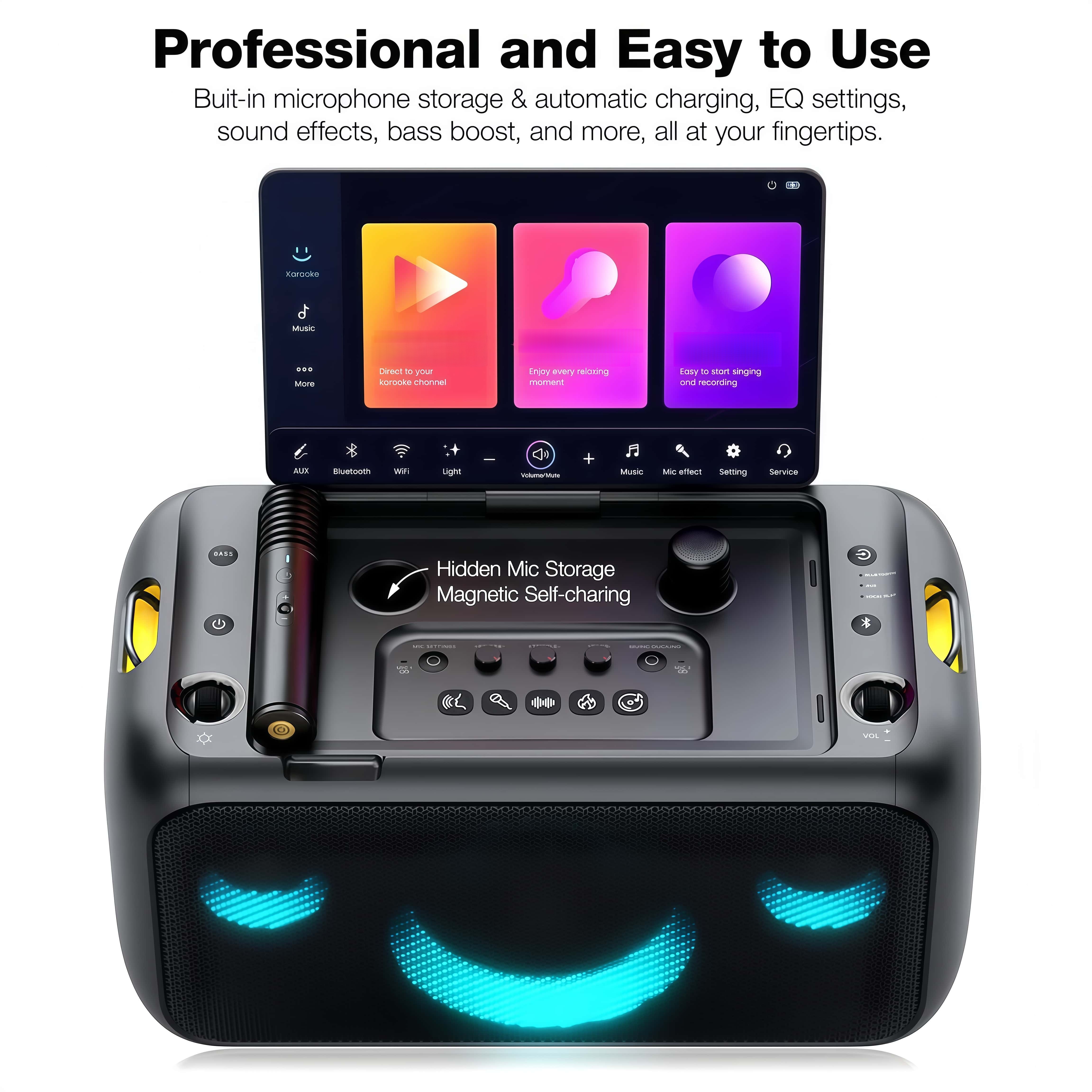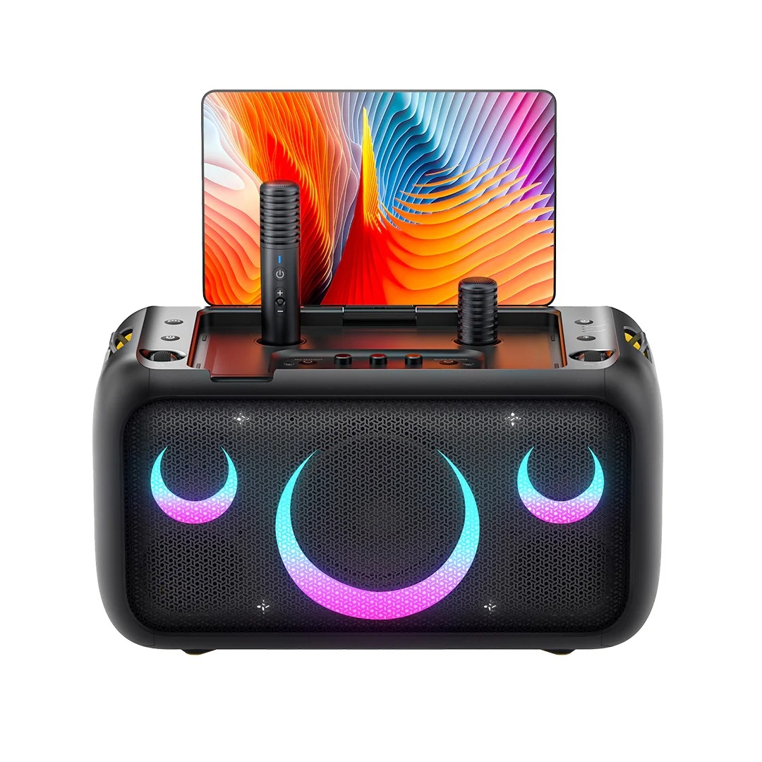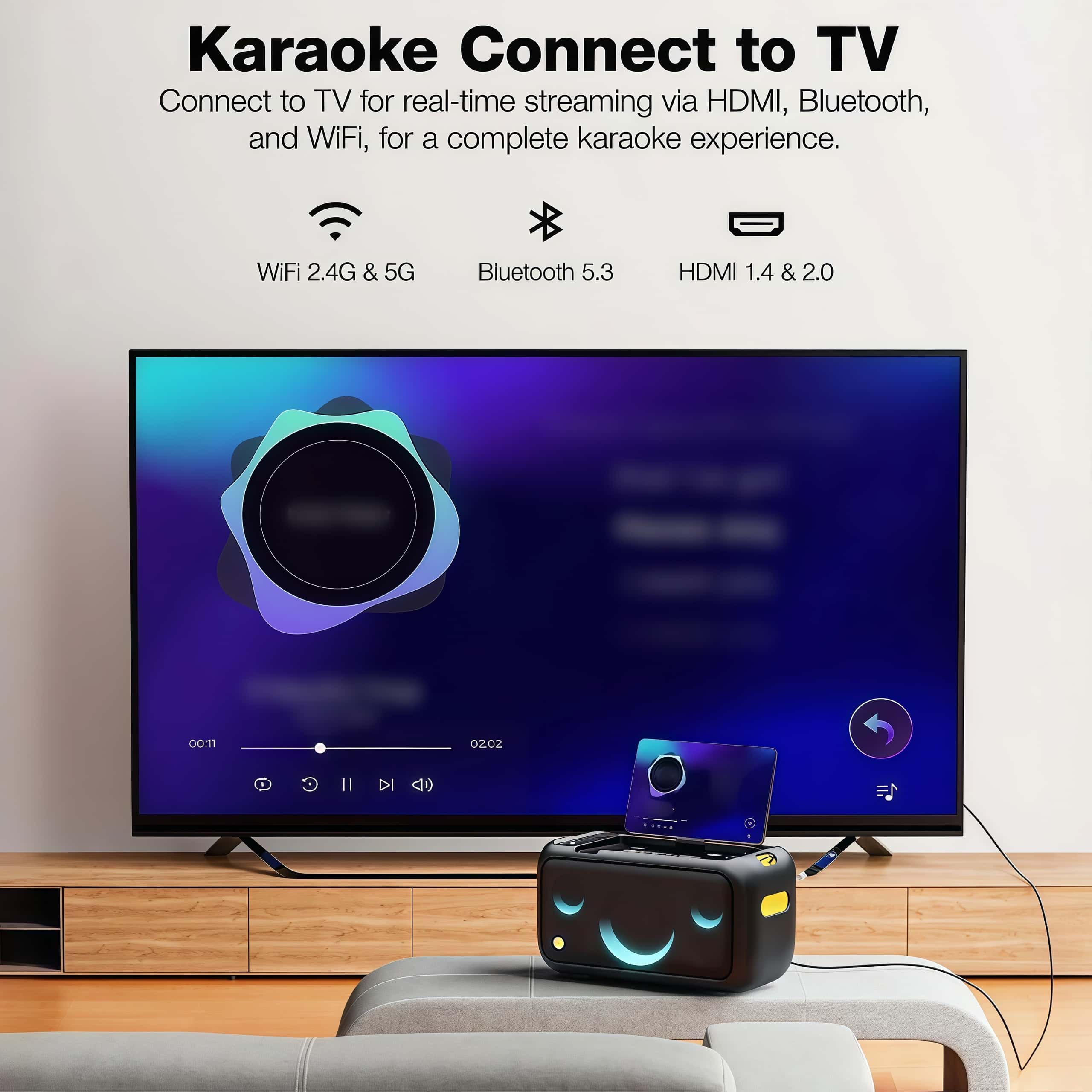 Supports WiFi 2.4G/5G, Bluetooth 5.3, and HDMI 1.4/2.0, so you can cast to your TV for a home theater-style KTV experience. Comes with a portable shoulder strap for easy outdoor carrying, plus 4 lighting modes and a smile-shaped ambient light to boost the party vibe.