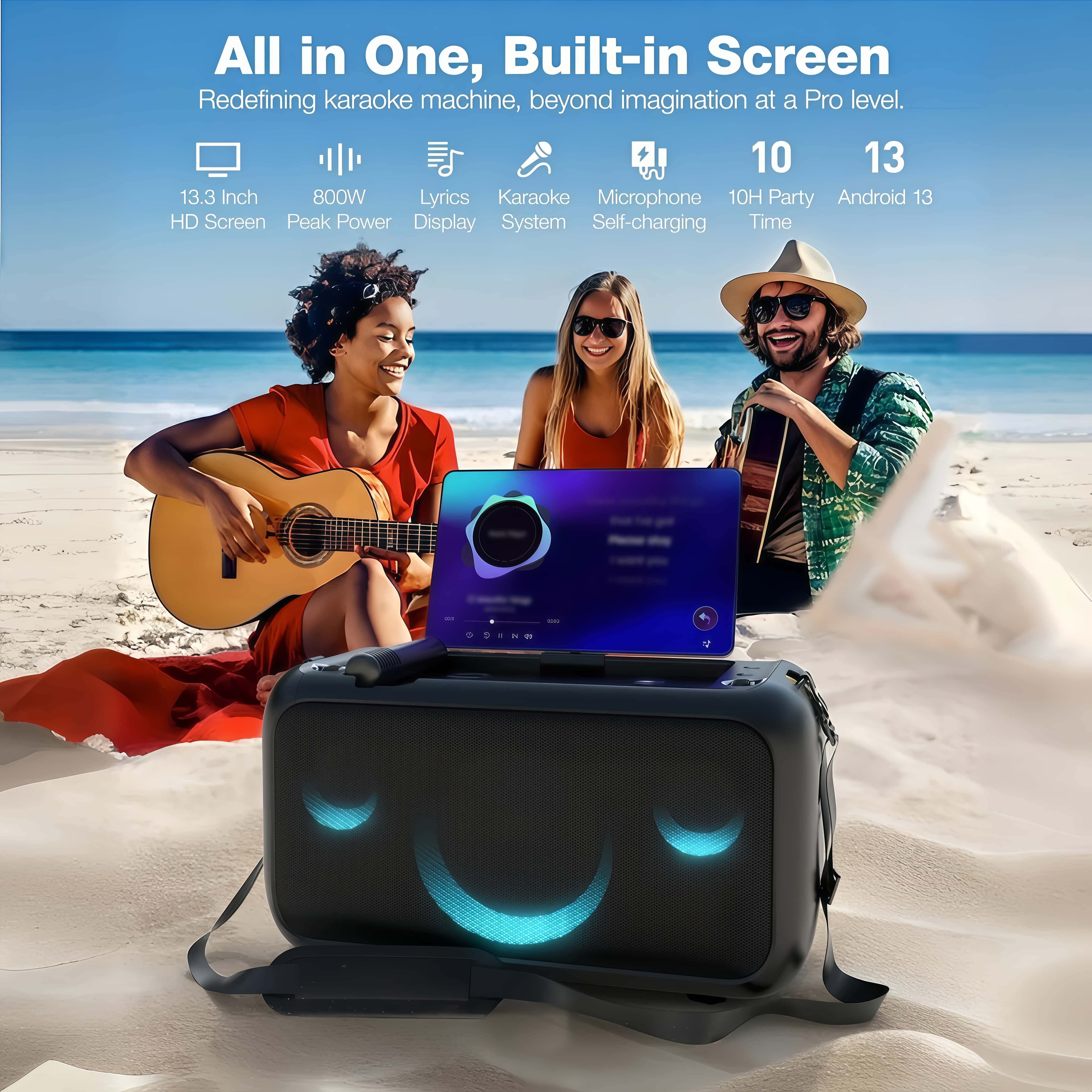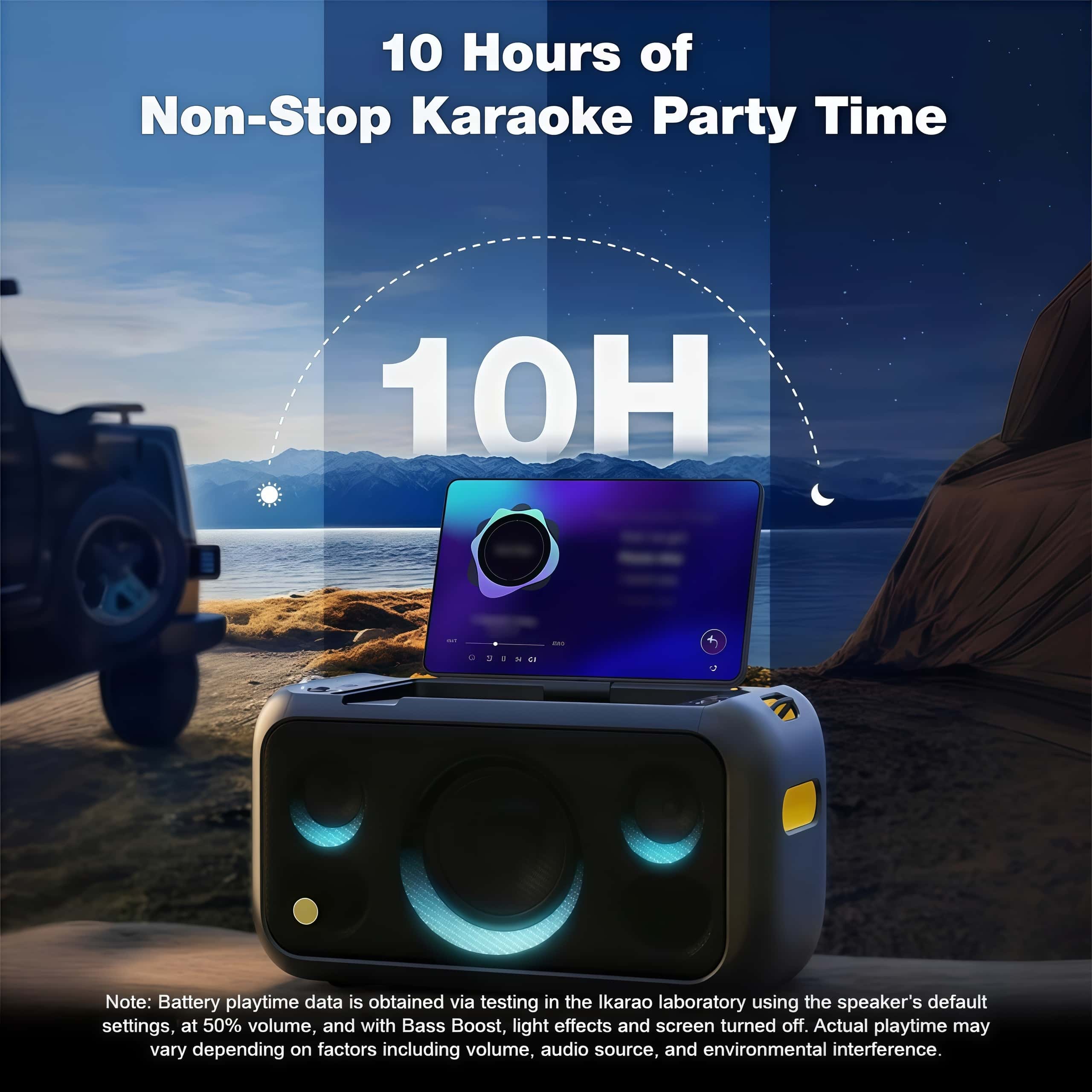 Large-capacity battery supports up to 10 hours of continuous singing (tested at 50% volume, with lights/screen off). Whether it's a camping trip, beach party, or friend's gathering, keep the party going from day to night.