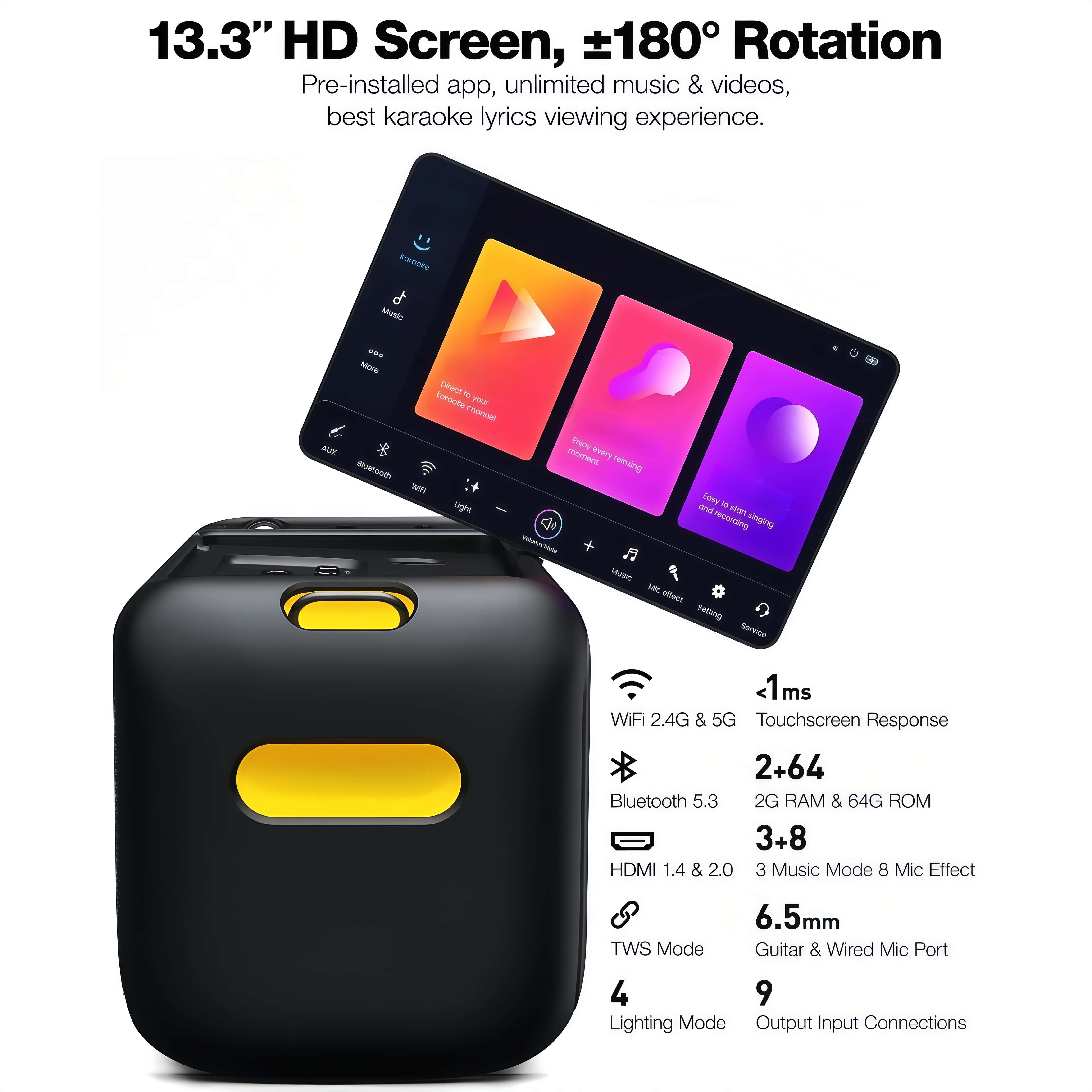 Equipped with a 13.3-inch high-definition touchscreen that supports ±180° free rotation, running on Android 13 system. Clear lyrics display makes it easy for everyone to sing along, no matter age or skill level.