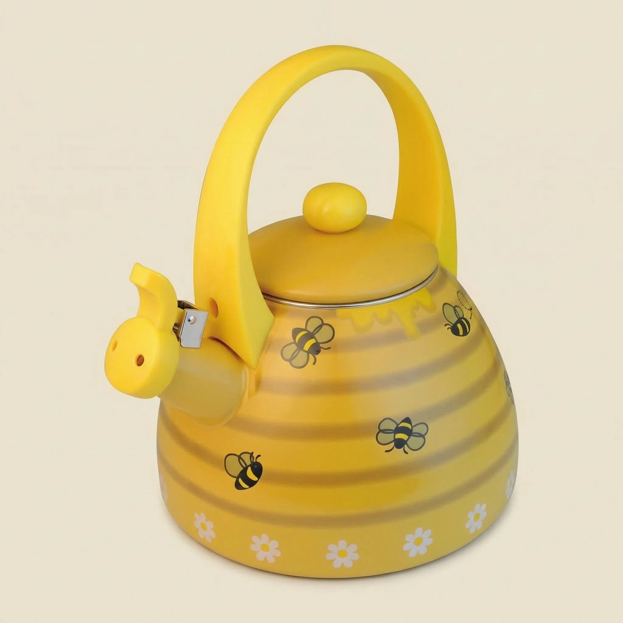 Introducing the Bee Hive Whistling Tea Kettle for Stovetop - a charming and practical addition to enhance your kitchen decor. With its delightful yellow bee hive pattern adorned with buzzing bees and blooming flowers, this stovetop tea kettle is perfect for those who seek a touch of nature-inspired whimsy in their kitchen accessories.