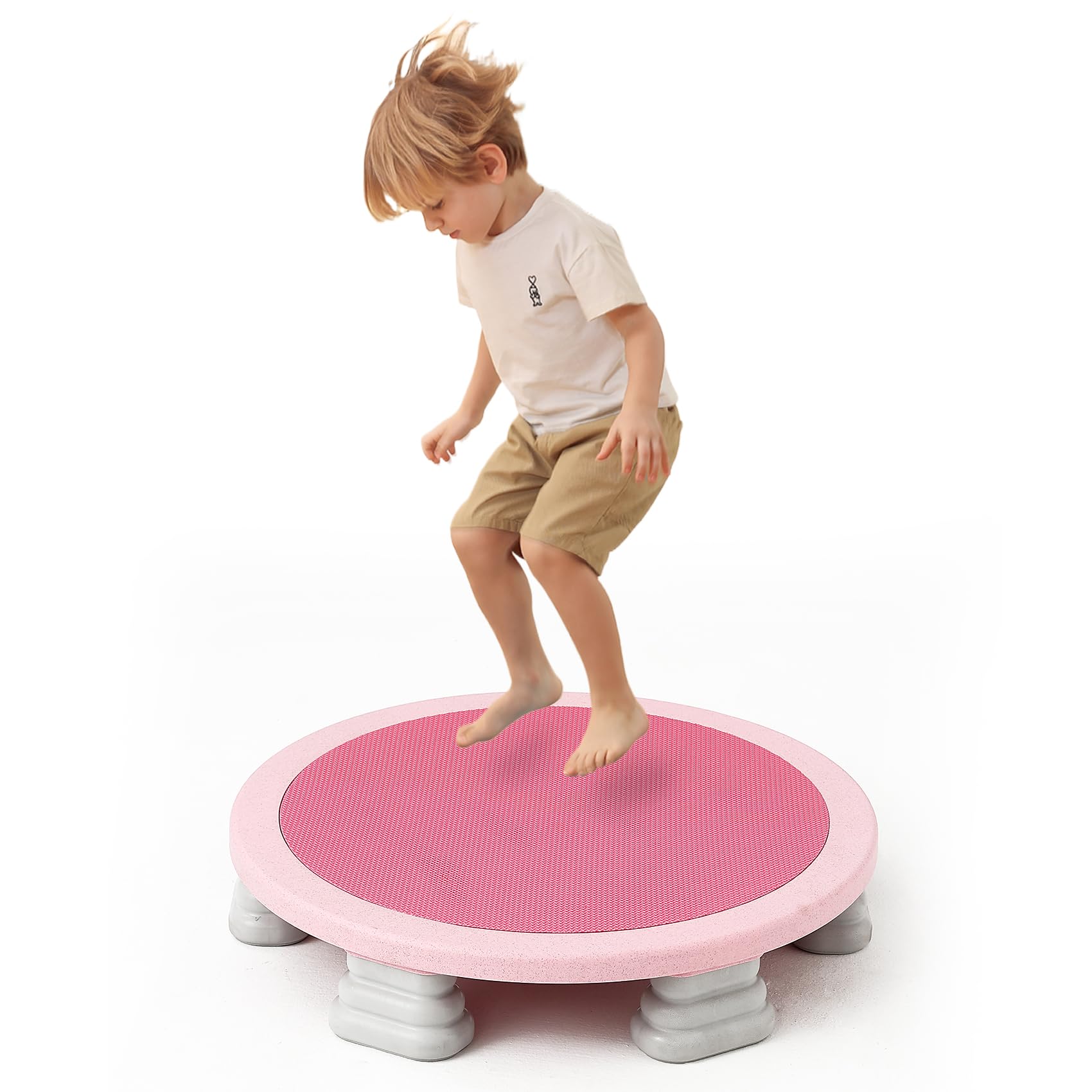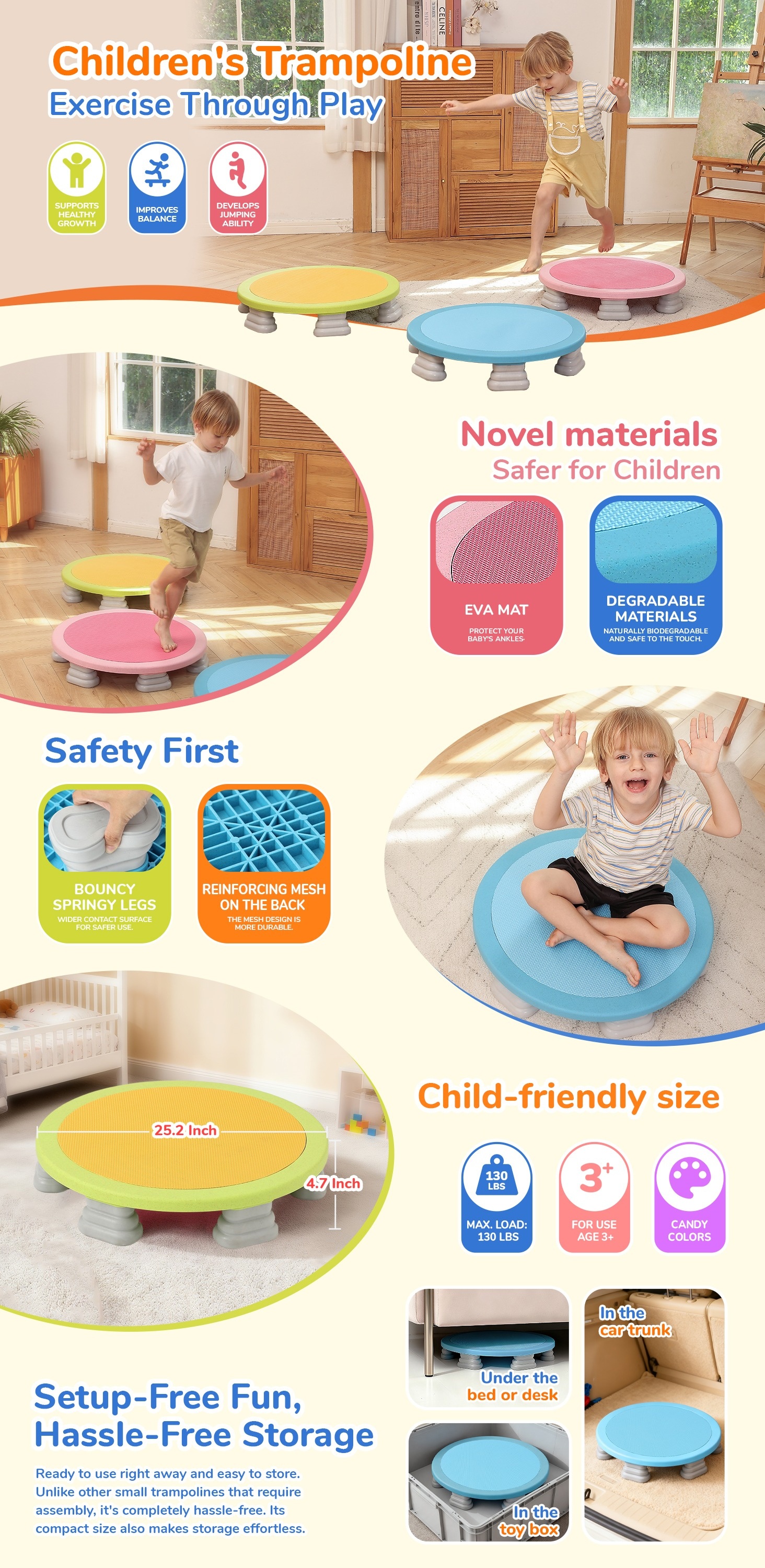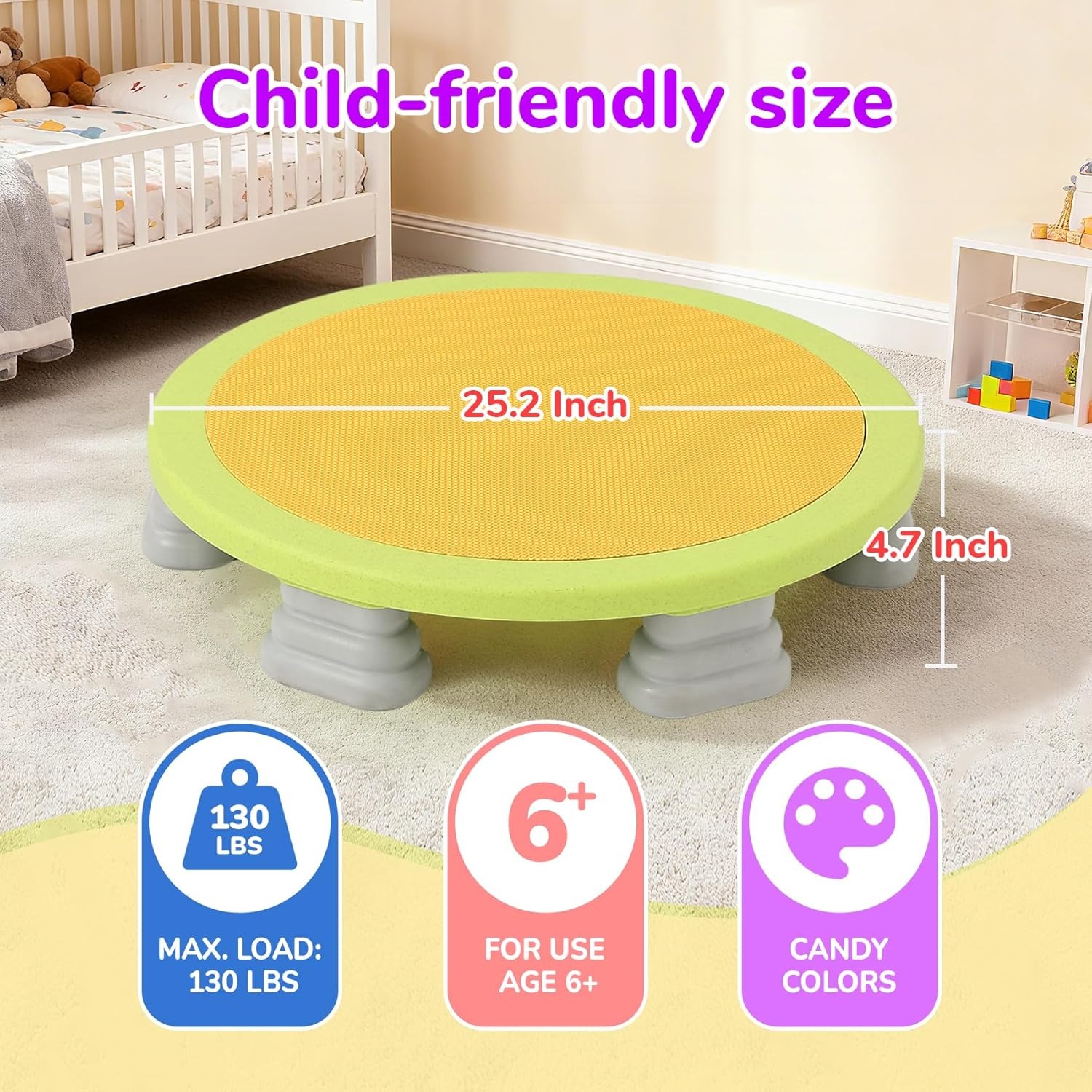 Mini Indoor Kids Trampoline: The Trampoline is 25 inches in diameter, designed for preschoolers ages 6 and up. It helps develop balance, coordination, and core strength—all while kids have fun bouncing.