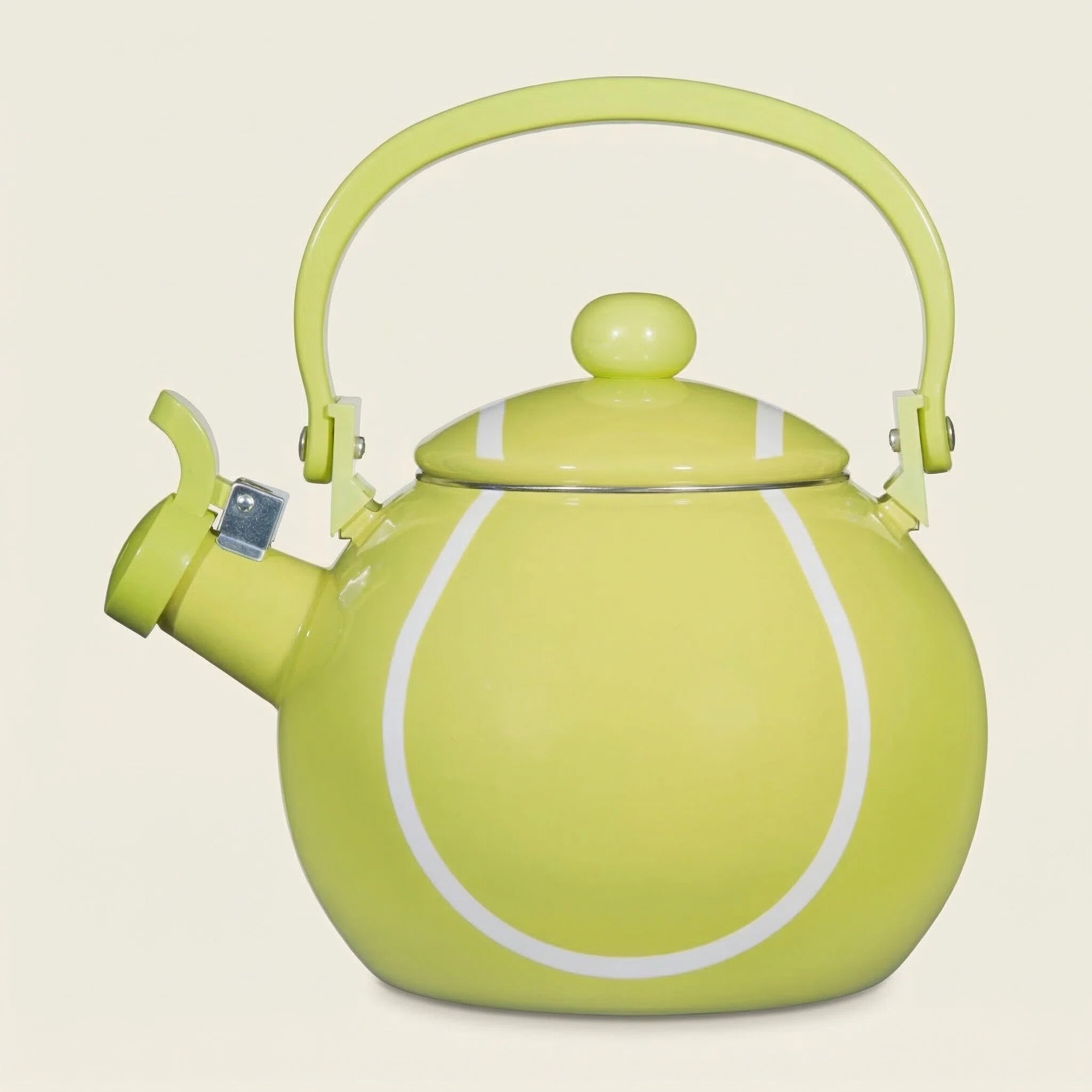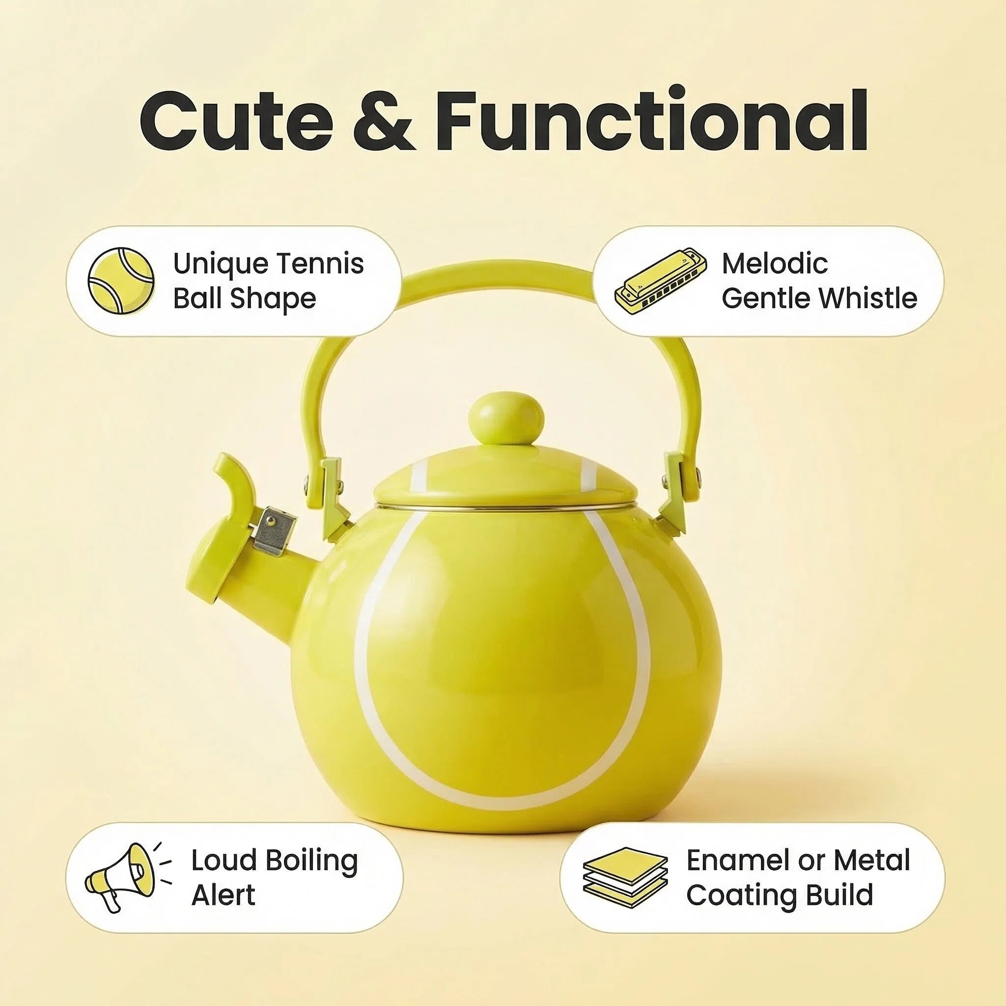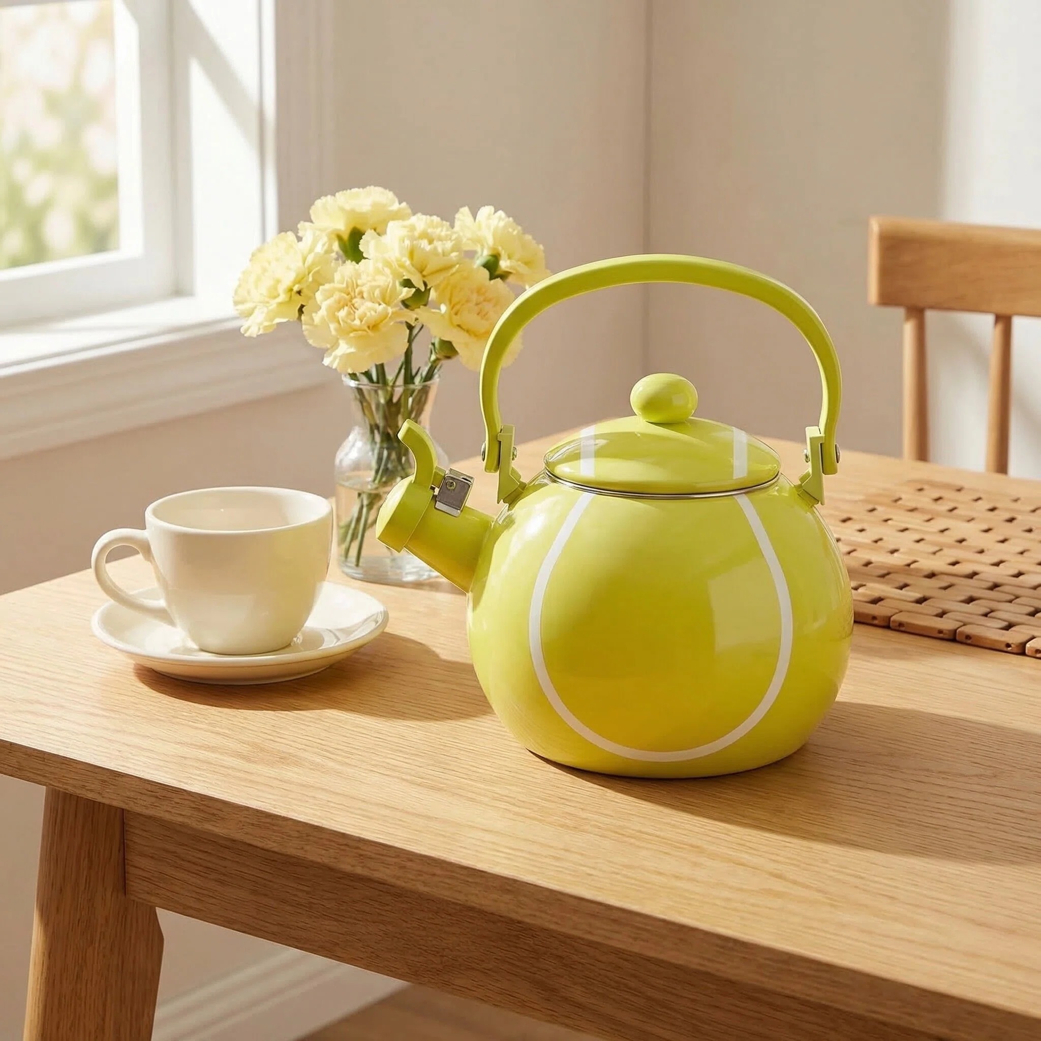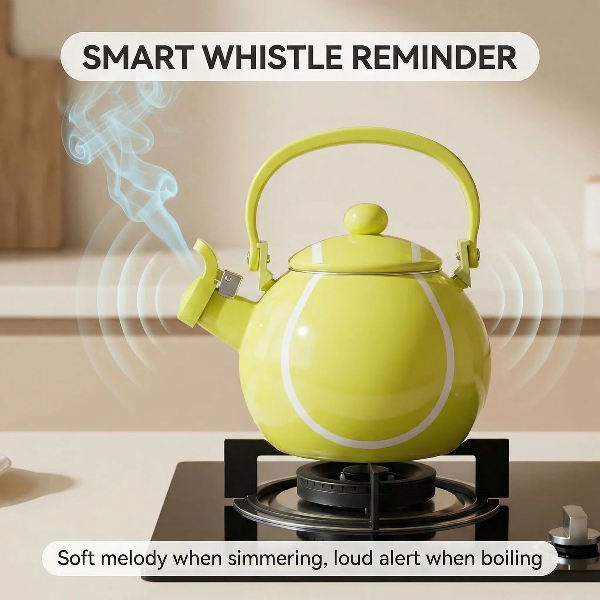 Introducing the Tennis Whistling Tea Kettle for Stovetop - a charming and practical addition to enhance your kitchen decor. With its delightful tennis ball-shaped design, this stovetop tea kettle is perfect for those who seek a touch of sporty whimsy in their kitchen accessories.
